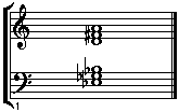The effects are extremely dissonant in all cases. Another example of bitonality is a different quote from Vertigo that Herrmann uses twice. In the final sequence of North by Northwest, Herrmann quotes the music in Vertigo that accompanies the dolly/zoom shot of Jimmy Stewart's point of view as he looks down the stairs. We hear it in North by Northwest when we see the high angle shot looking down the mountain at Eve hanging to the ledge, and again as Leonard falls after he is shot. The structure is a D major triad over an E flat minor triad, as follows.